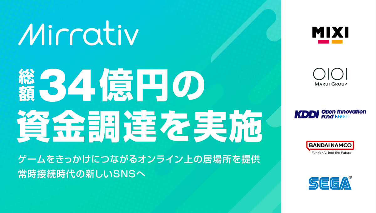 スマホゲーム配信者数日本一のゲーム配信プラットフォーム「Mirrativ(ミラティブ)」(以下Mirrativ)を運営する株式会社ミラティブ(本社:東京都目黒区 代表取締役:赤川隼一)は、MIXI、丸井グループ、KDDI Open Innovation Fund 3号、バンダイナムコエンターテインメント、セガの5社を新たな引受先とした第三者割当増資を実施いたしました。商工組合中央金庫、三菱UFJ銀行、みずほ銀行、りそな銀行からの融資を含め、合計34億円の資金調達となります。今回の調達により、当社の累計調達額は約97億円となります。