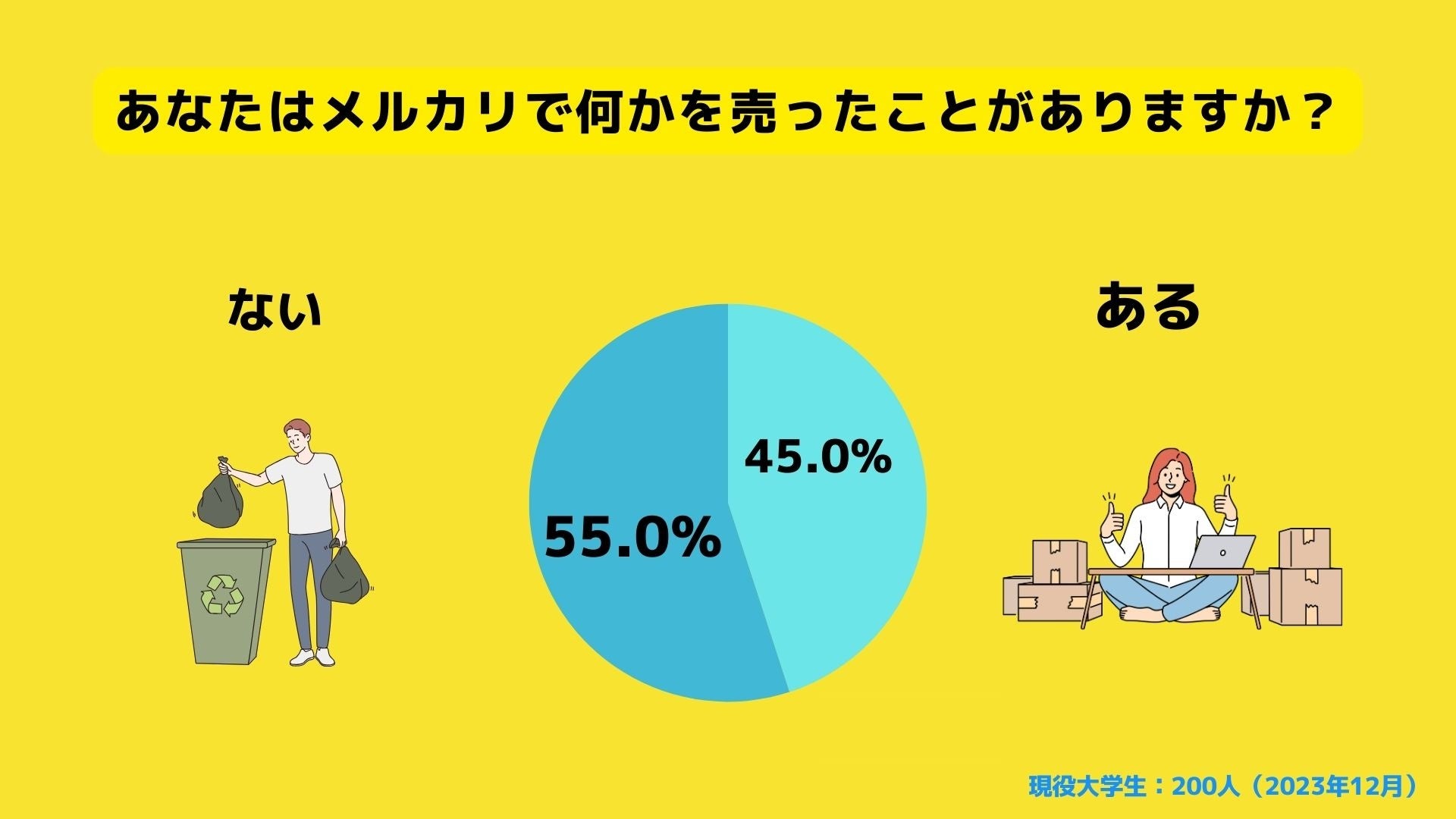■大学生の45.0%がメルカリで何かを売ったことがあると回答。