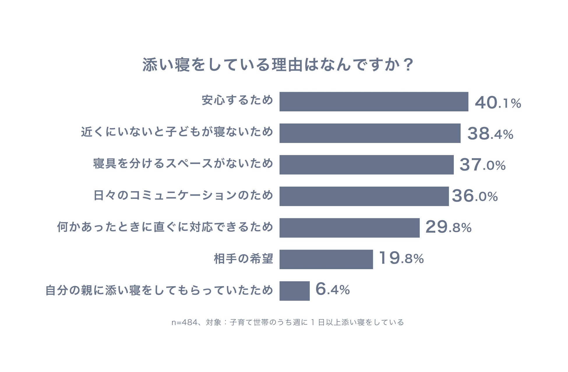 添い寝を行う理由としては「安心するため」を筆頭に、「近くにいないと子どもが寝ないため」「寝具を分けるスペースがないため」「日々のコミュニケーションのため」と多岐にわたり、自分自身の要望や物理的な要因、相手の要望など様々な理由により添い寝をしていることが明らかになりました。