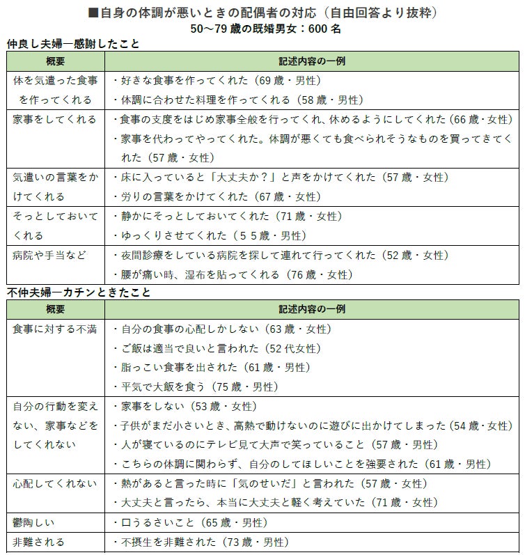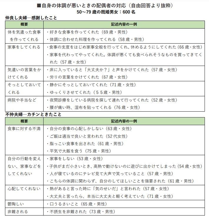 ・仲良し夫婦ほど、具合の悪い時に「配偶者がよくしてくれる」と回答。仲良し夫婦が、自分の具合が悪い時に感謝したことは、「体調に合わせた料理を作ってくれること」「家事をしてくれること」「気遣いの言葉をかけてくれること」など。一方、不仲夫婦がカチンときたことは、「脂っこい食事を出された」や「自分の食事の心配しかしない」など食に関することや、「自分の行動を変えない」「心配してくれない」「非難される」など。