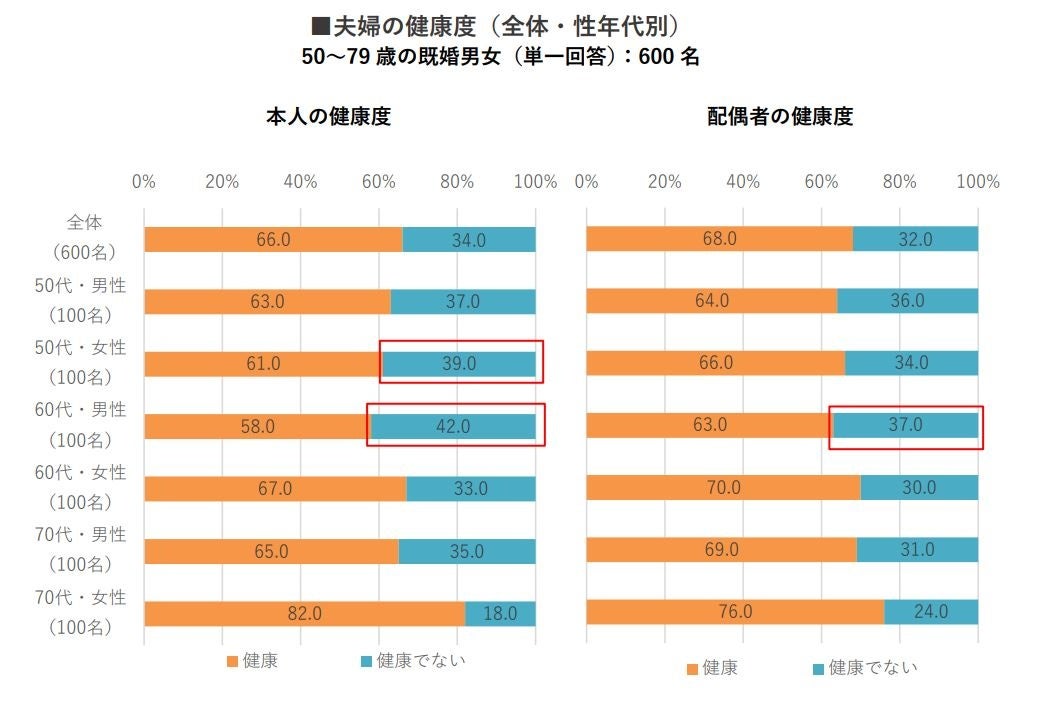・夫婦関係の満足度が低い50代女性、60代男性は、健康でない割合が高い。特に、60代男性は本人に加えて配偶者も健康でない割合が高い。
