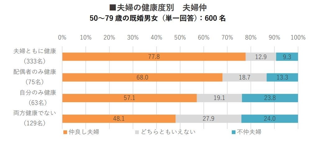 ・夫婦ともに健康な人の約8割が仲良し夫婦。健康な夫婦ほど仲良し夫婦の割合が高い。