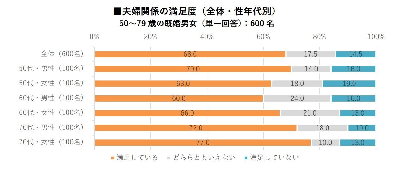 ⇒夫婦関係の満足度は全体平均で68.0%。50代女性・60代男性でやや満足度が低く、一方70代男女は高い。