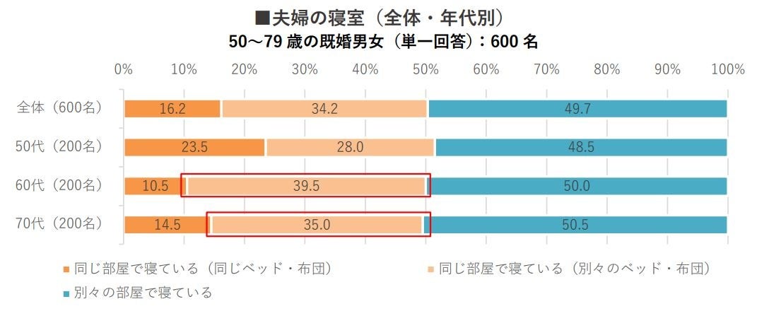 ・夫婦の寝室は、「同じ部屋(同じベッド・布団で寝ている)(16.2%)」「同じ部屋(別のベッド・布団)(34.2%)」「別の部屋で寝ている(49.7%)」となる。60代以上になると、同じ部屋でも別のベッド・布団が約4割に増加。