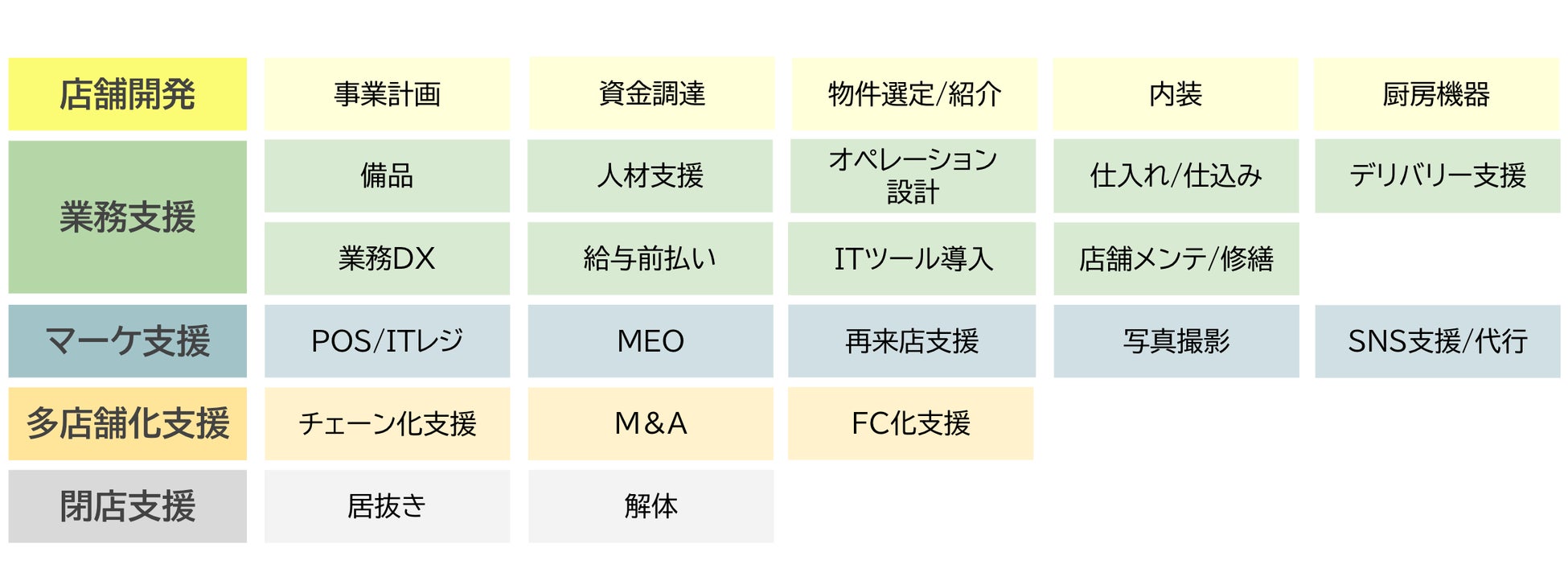・各種マッチング(資金調達、不動産、内装設計施工、卸売会社、通信サービス、各種メーカー、マーケティング、広告等)