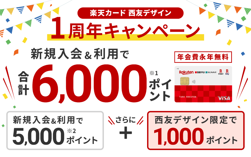 楽天カード株式会社(以下「当社」)は、昨年4月に発行を開始した「楽天カード 西友デザイン」の1周年を記念して、本日5月1日(月)から5月31日(水)まで「楽天カード 西友デザイン」限定で、通常5,000ポイント進呈(※)の新規入会・利用キャンペーンに、さらに1,000ポイントを追加で進呈するキャンペーンを開始いたします。