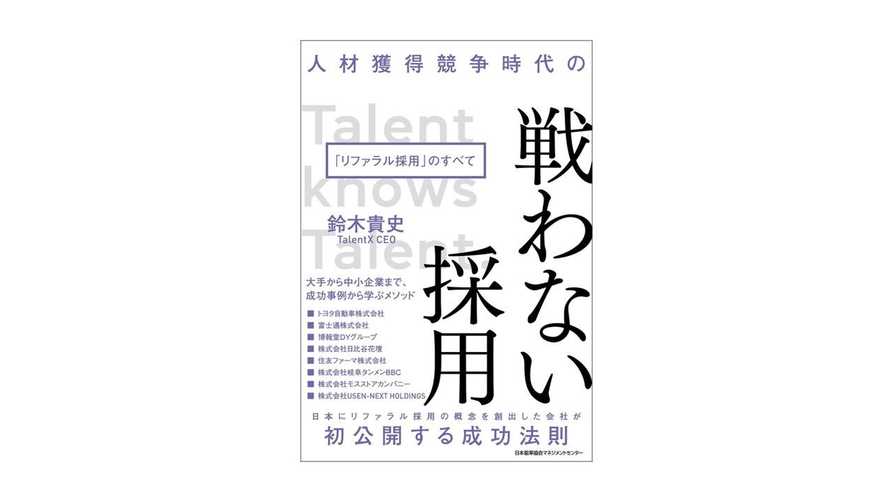 日本に「リファラル採用」の概念を啓蒙したTalentX代表・鈴木貴史が、全国800社の企業、70万人の社員ユーザーに活用いただいた豊富な事例と具体的なノウハウをもとに、企業成長に貢献する優秀なタレント人材を惹きつけて離さない「リファラル採用」のメソッドを本書にまとめました。本書では、従来の採用は企業と求職者が対立構造になっており、それがうまくいかない原因になっていると指摘し、企業と求職者が対等な立場で向き合い、長期的な関係を築く「戦わない採用」を解説しています。