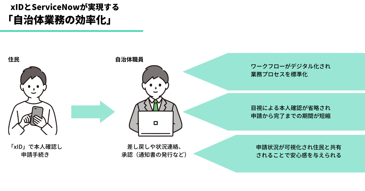 「xID API」と「Now Platform」を連携することで、今まで本人確認や電子署名が必要であった行政手続きをオンライン化することが可能になります。住民は窓口に行き、本人確認書類の提出や個人情報の記入が不要になり、自治体はワンスオンリー(※)で完結する利便性とセキュリティ性の高い自治体サービスを提供することができます。 また「Now Platform」では、住民サービス提供のWebポータルと申請内容の処理を行う自治体側の受付・承認システムを一気通貫で構築可能であることを活かして、住民のサービス向上だけでなく、自治体業務の効率化も付加価値としてご提供します。