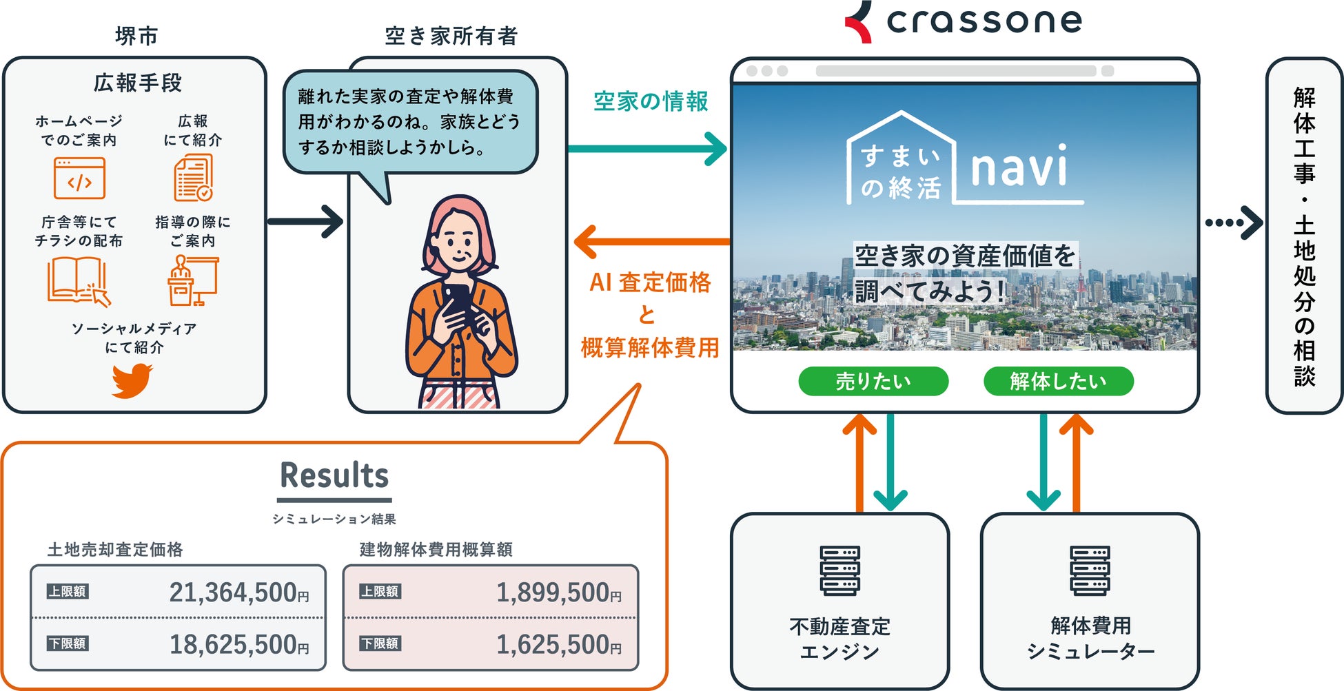 - 市内の空き家の所有者等からの相談に対応する際に「すまいの終活ナビ」を積極的に活用(URL:https://www.crassone.jp/simulator/navi/osaka/sakaishi)