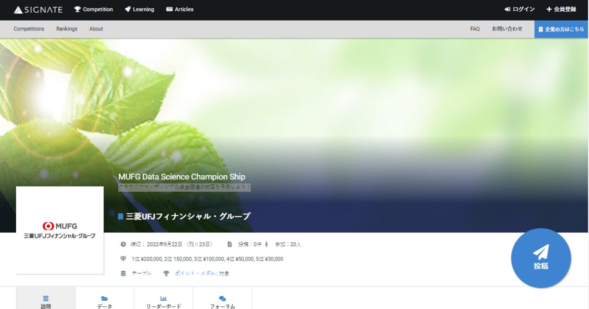 SIGNATEにて、株式会社三菱UFJフィナンシャル・グループ主催『MUFG Data Science Champion Ship』開催!