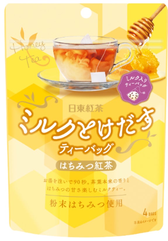 「茶葉×ミルク」に粉末はちみつを加え、茶葉本来の香りとはちみつの甘さが楽しめるミルクティーに仕上げました。「はちみつ×紅茶」のトレンドをミルクとけだすティーバッグシリーズでも新発売します。