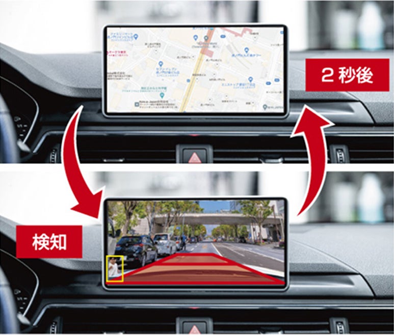 AIフロントカメラが、発進時にドライバー目線よりも高い位置から目視で確認出来ない死角をカバーし、検知時にはナビゲーション画面を自動で切り替えてお知らせします。検知エリアはおおよそ1.5m~3.5m、検知枠表示と赤くハイライト表示をします。