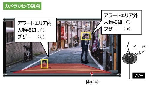 人(肩より上)がモニター検知枠に接した時に1トーンのアラートがお知らせします。