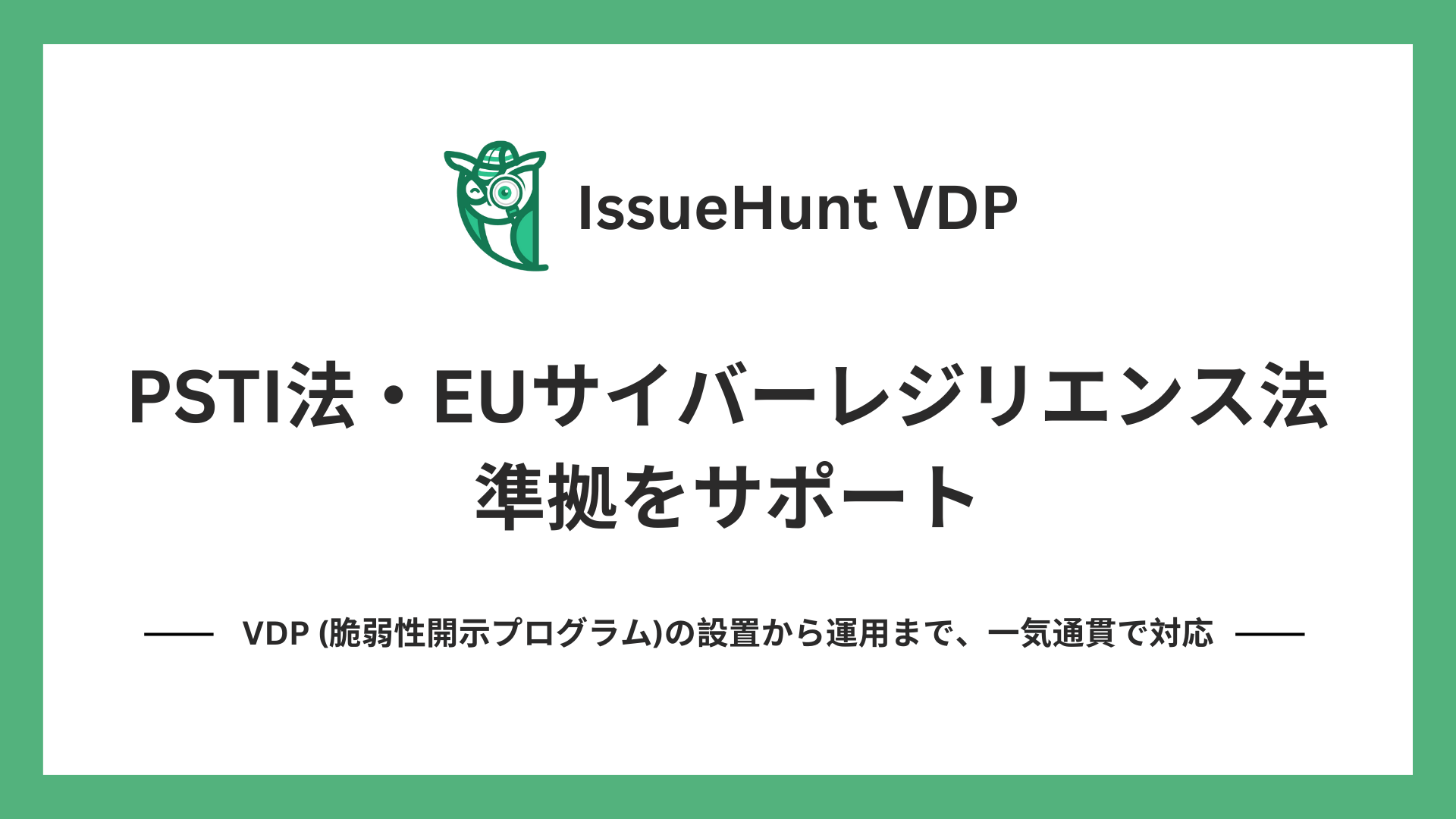 IssueHunt株式会社、VDP(脆弱性開示プログラム)の設置サービス「IssueHunt VDP」を通じ、PSTI法やEUサイバーレジリエンス法の準拠をサポート