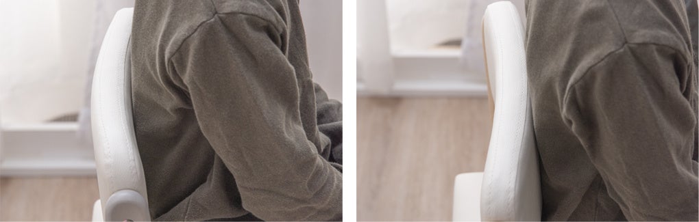 (↓写真右は背もたれの裏側を使って背骨のS字をサポートすることができます。)