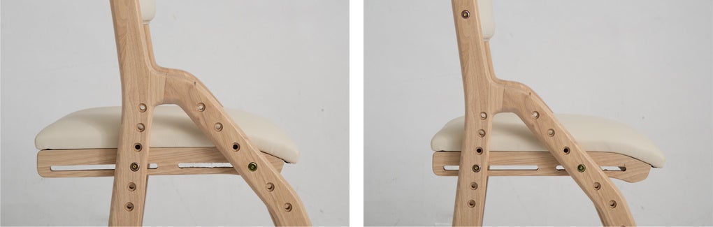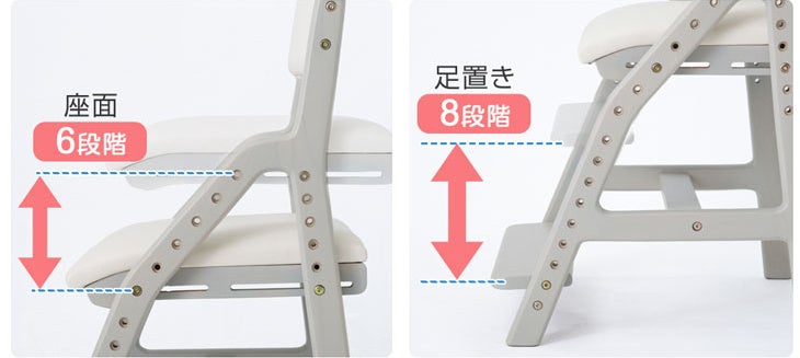 いくつになっても「ちょうどいい高さ」で集中できる姿勢を生み出せるよう、座面は6段階、足置きは8段階の調節機能を搭載しました。この調整段数は従来の学習チェアに比べると、ともに多くなっているので、使うお子さま1人1人により合わせやすい仕様となっております。