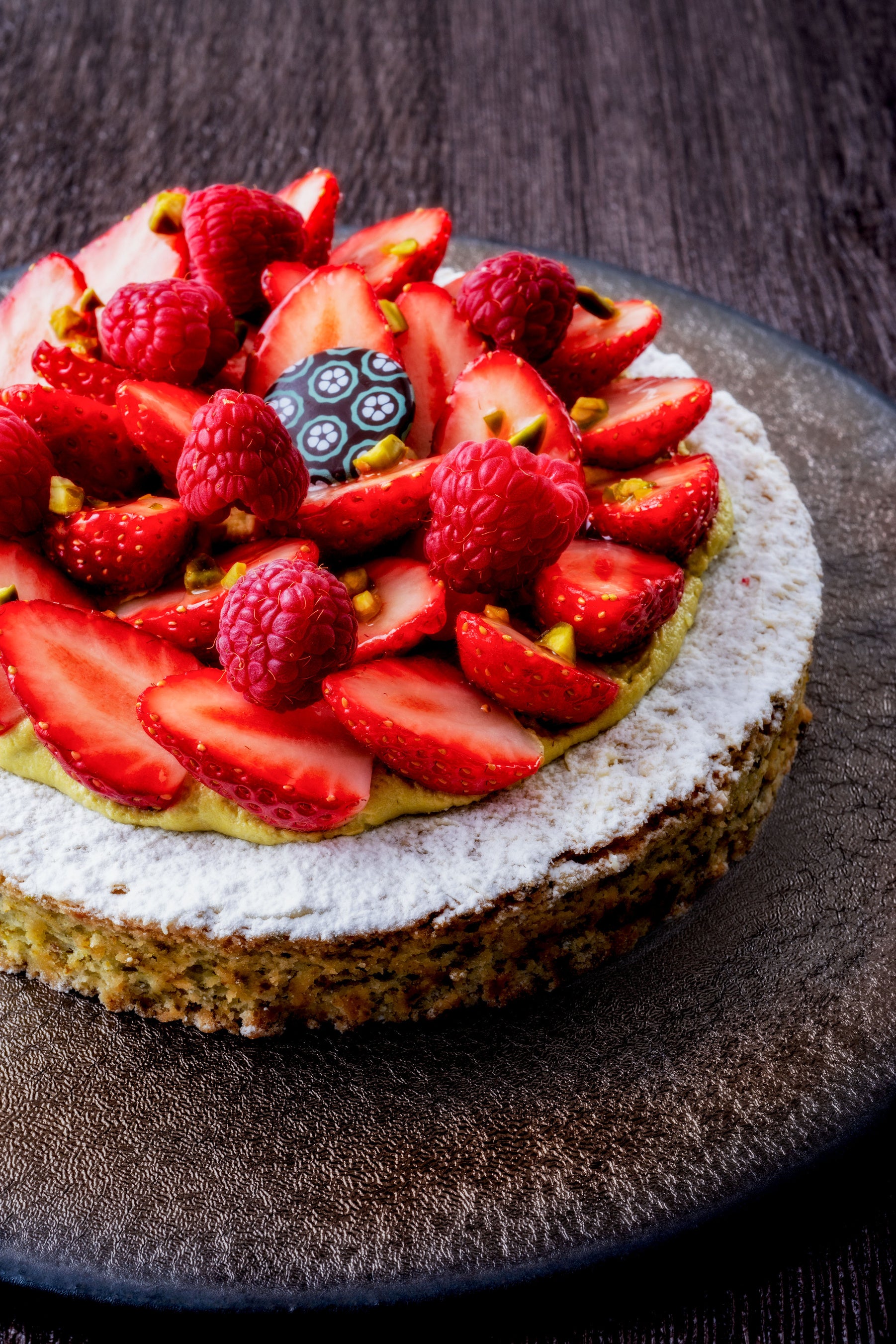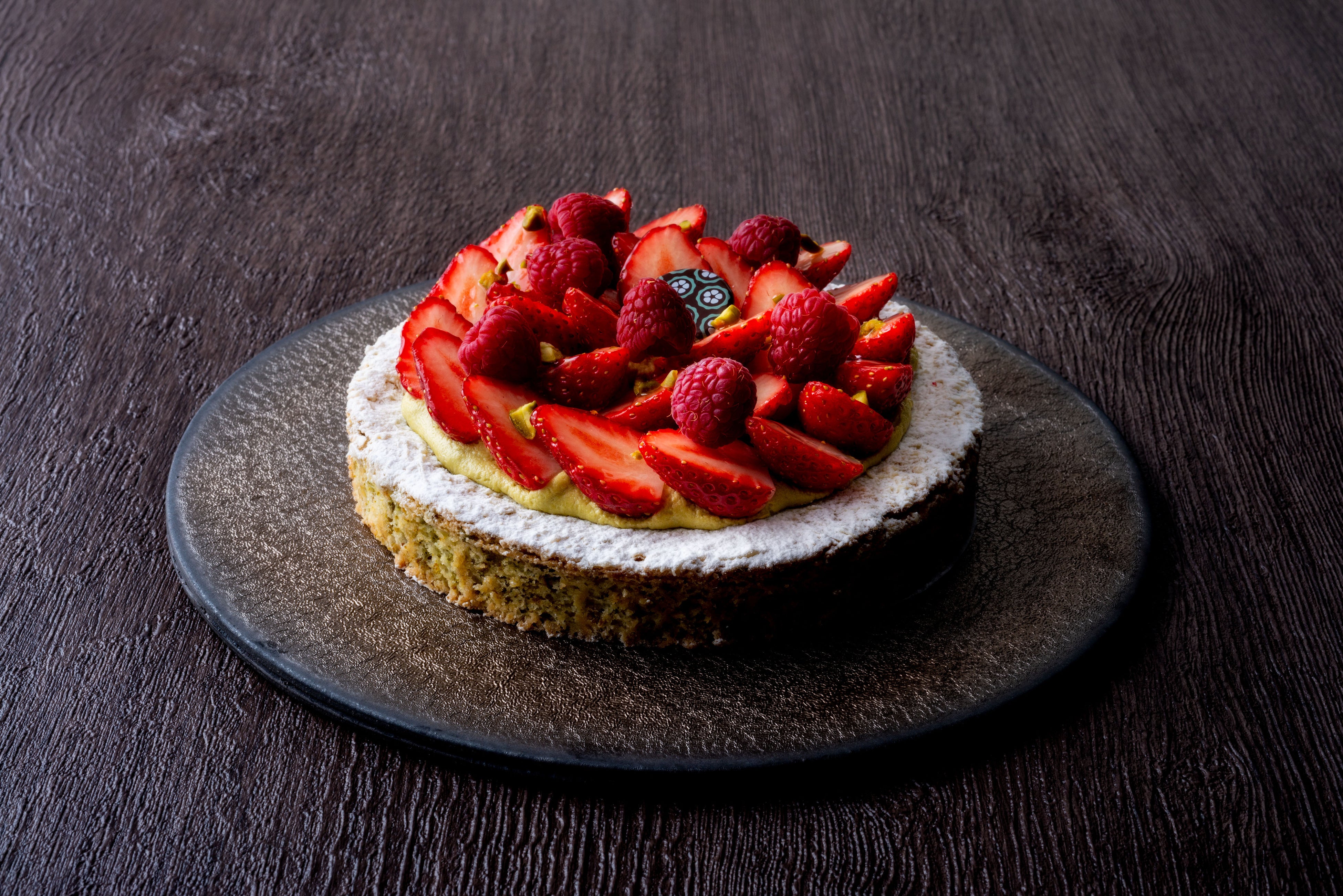 「ダックワーズ ピスターシュ」は季節により飾るフルーツを変え、東京でも年間を通じて人気のガトー。フランボワーズといちごを飾りクリスマスケーキとしてこの時期限定で登場。薄緑のダックワーズピスタチオのコク豊かな生地とフルーツをつなぐ甘さ控えめのピスタチオのクリームはバランスがよく、フルーツの甘酸っぱさとダックワーズの食感を引き立てました。