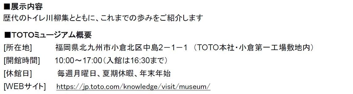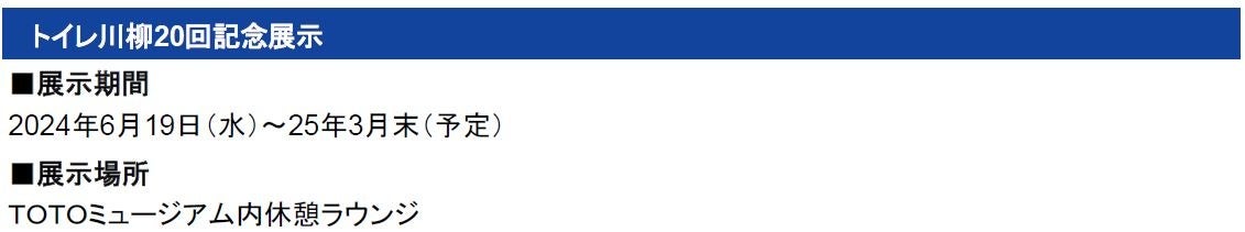 また、TOTOミュージアム(福岡県北九州市)の休憩ラウンジにて、2024年6月19日(水)~2025年3月末(予定)まで「トイレ川柳20回記念展示」を開催します。展示では、1(ワン)ロールシアターの上映やトイレ川柳の歴史を紹介するパネルと、歴代のトイレ川柳集の展示を行います。