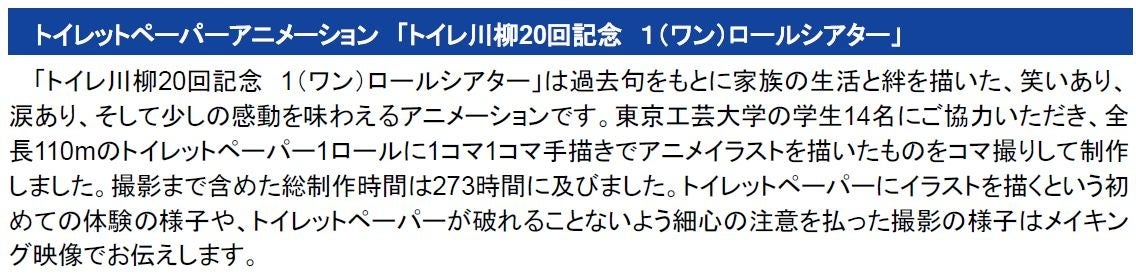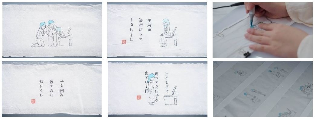 一方で毎日必ず使用するものだからこそ、トイレの変わらない日常や家族の生活が詠まれた句も多数あります。20回目の募集を記念して、家族の様々なシーンを見つめてきた過去句をもとに、トイレットペーパーに手描きしたアニメーション、「トイレ川柳20回記念 1(ワン)ロールシアター」を制作しました。トイレ川柳で詠まれたエピソードをもとに、家族の思い出を物語に仕立てたもので、「子を囲み 皆で力む 初トイレ」から始まる少女の成長を描いています。トイレットペーパーに1コマ1コマ手描きでアニメイラストを描き、それをコマ撮りして制作しました。トイレットペーパー1ロール(約110m)分のイラストは原画600枚程度に相当し、撮影まで含めた総制作時間は273時間に及びました。2024年6月17日(月)から、TOTOウェブサイト、ソーシャルメディアで公開します。