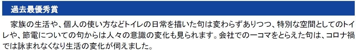 句には時代を感じられるものが多数あります。2000年代には「ケータイを 切って至福の 小部屋かな」のように、携帯電話の普及を感じられる句や、ウォシュレットの浸透やトイレ機能の進化が見受けられる「部屋探し ウォシュレットで ここに決め」 「フタが開き 誰かに見られて いるような」などの句が詠まれました。2010年半ばには「旅行先 トイレの質が 宿の質」のように外出先のトイレにも快適性、質を求めている様子が表現されています。快適性や質の向上と共に海外に誇れる日本のトイレ文化となったことが「日本に 初めて来たら トイレ見て」の句を通じて感じられます。震災時やコロナ禍には「断水で 水が命と 知るトイレ」 「念入りに トイレを磨く 自粛中」などの句が詠まれ、あらためて当たり前の日常の大切さに気づかされました。