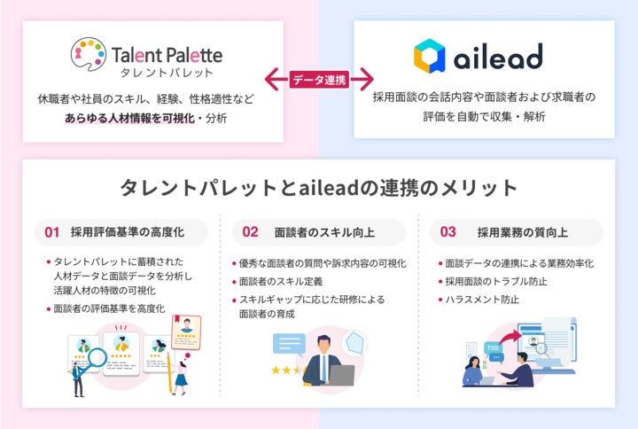 株式会社ailead(本社:東京都港区、代表取締役:杉山大幹)が提供する商談・面談データ解析クラウド「ailead(エーアイリード)」は、株式会社プラスアルファ・コンサルティング(本社:東京都港区、代表取締役社長:三室克哉、以下:PAC)が提供するタレントマネジメントシステム「Talent Palette(以下:タレントパレット)」において、採用面談データを連携、分析する 「採用面談要約・評価フィードバック機能」 を提供開始します。
