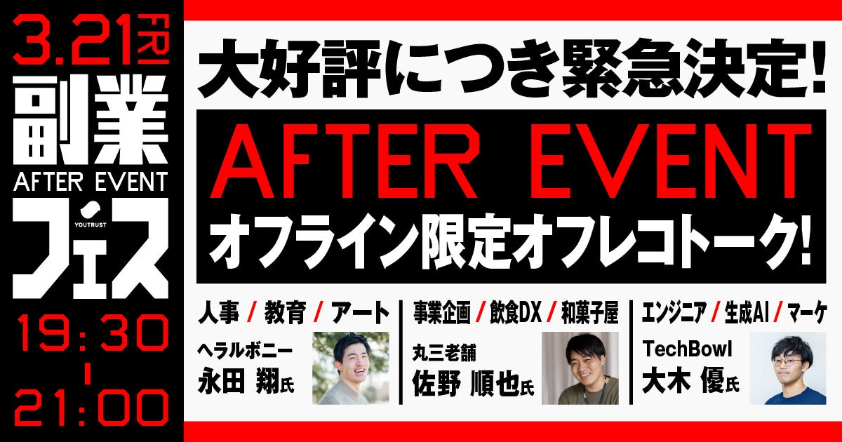 ※アフターイベントは原則副業フェスに参加申込していた方限定のイベントです。プレスをご覧になった方が参加希望される場合は別途主催のYOUTRUST(support@youtrust.jp)までご相談ください。