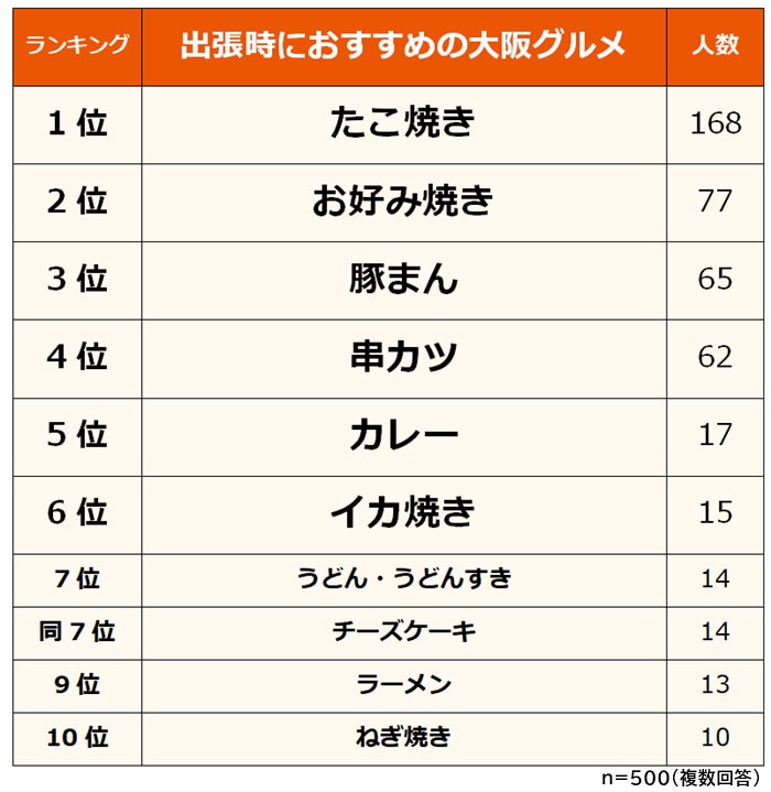 男女500人に「出張するなら食べておきたい、おすすめの大阪グルメ」を聞いたところ、回答は以下のようになりました。