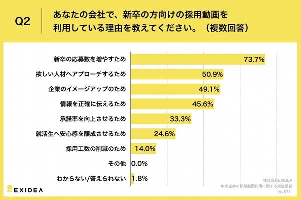 Q1で「はい」と回答した方に、「Q2.あなたの会社で、新卒の方向けの採用動画を利用している理由を教えてください。(複数回答)」(n=57)と質問したところ、「新卒の応募数を増やすため」が73.7%、「欲しい人材へアプローチするため」が50.9%、「企業のイメージアップのため」が49.1%という回答となりました。