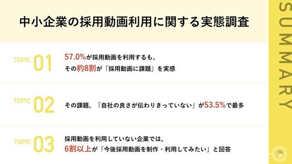 【中小企業の新卒採用における採用動画の利用実態調査】57.0%が採用動画を利用するも、そのうち約8割が「採用動画に課題」を実感「自社の良さが伝わりきっていない」、「コンセプト設計ができていない」など