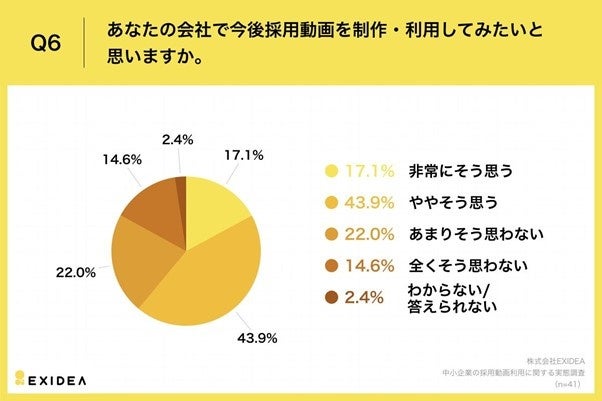 Q1で「いいえ」と回答した方に、「Q6.あなたの会社で今後採用動画を制作・利用してみたいと思いますか。」(n=41)と質問したところ、「非常にそう思う」が17.1%、「ややそう思う」が43.9%、という回答となりました。