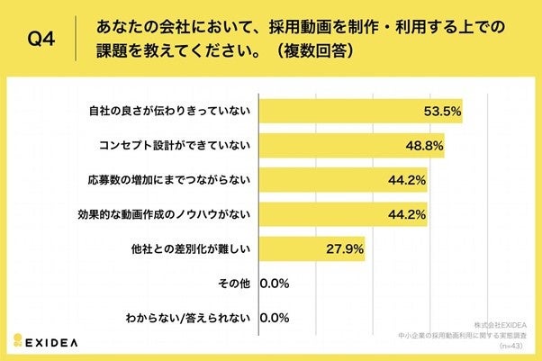 Q3で「かなりある」「ややある」と回答した方に、「Q4.あなたの会社において、採用動画を制作・利用する上での課題を教えてください。(複数回答)」(n=43)と質問したところ、「自社の良さが伝わりきっていない」が53.5%、「コンセプト設計ができていない」が48.8%という回答となりました。