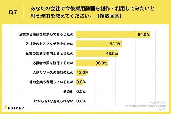 Q6で「非常にそう思う」「ややそう思う」と回答した方に、「Q7.あなたの会社で今後採用動画を制作・利用してみたいと思う理由を教えてください。(複数回答)」(n=25)と質問したところ、「企業の価値観を理解してもらうため」が84.0%、「入社後のミスマッチ防止のため」が52.0%、「企業の知名度を向上させるため」が48.0%という回答となりました。
