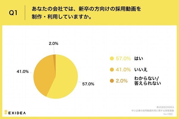 「Q1.あなたの会社では、新卒の方向けの採用動画を制作・利用していますか。」(n=100)と質問したところ、「はい」が57.0%、「いいえ」が41.0%という回答となりました。