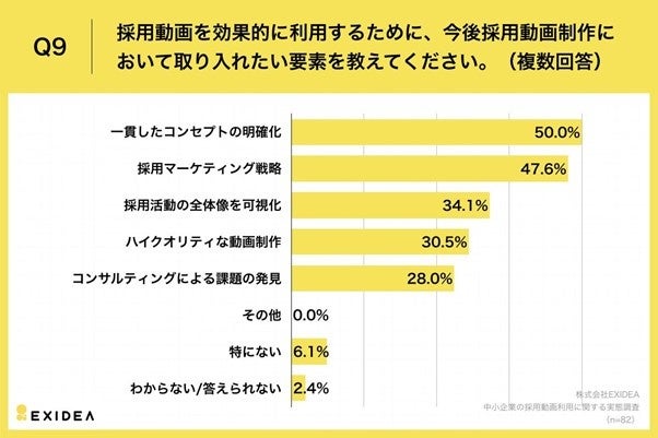 Q1で「はい」、またはQ6で「非常にそう思う」「ややそう思う」と回答した方に、「Q9.採用動画を効果的に利用するために、今後採用動画制作において取り入れたい要素を教えてください。(複数回答)」(n=82)と質問したところ、「一貫したコンセプトの明確化」が50.0%、「採用マーケティング戦略」が47.6%、「採用活動の全体像を可視化」が34.1%という回答となりました。