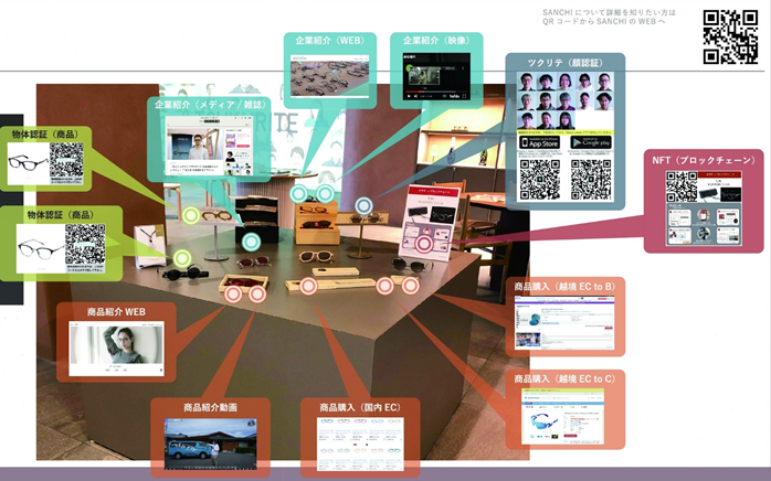 「SANCHI(サンチ)」のテーマは“ブランドを魅せる”です。このイベントの位置付けは“産地の実験場”です。最新のテクノロジーと融合し、眼鏡、繊維、漆器、3つの伝統工芸を軸に循環型社会への適応に向け、新しい産地のあり方、モノづくりの捉え方を模索しています。各参加企業の製品に貼られたHyperJコードをスマホで読み取ると、製品のPR動画やブロックチェーン証明書が表示されます。伝統工芸品が制作された時の状況説明や使用した素材、技術優位点などを生産者が直接語る動画によって、製品の裏側に隠れた魅力を伝えることができます。本物であることを証明することで、購入者に安心感を与え、ブランド力を高める効果が期待できます。