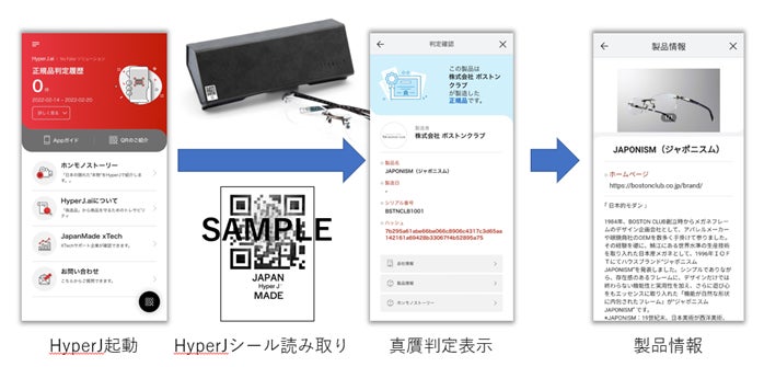 眼鏡、繊維、漆器、3つの伝統工芸品を生産する参加企業の製品に付与されたHyperJシールをスマートフォンから読み取ることにより、作品が正規品であるか、偽造品であるかを簡単に・瞬時に判別することが可能です。作品情報はブロックチェーン上に登録されており、第三者による情報の改ざんが非常に困難となっているため、作品の購入者に安心感を与えるとともに、ブランド力を高めることが可能です。