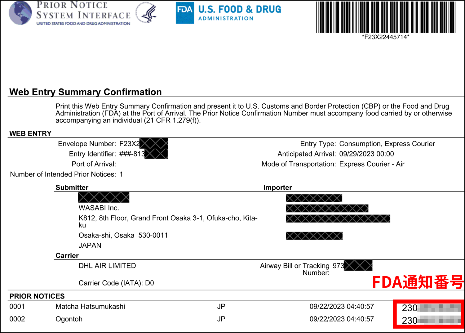 このFDAの事前通知確認書、AWB(航空貨物運送状)、インボイスを揃えて荷物に添付することで、食品の発送が可能になります。