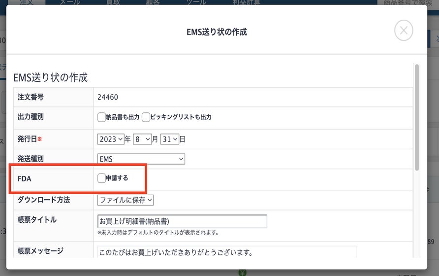 送り状の作成と同時に、FDAへ事前通知(ワンタイム通知)が必要な場合は「申請する」にチェックを入れ手続きを行うことができます。