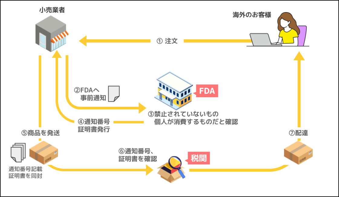 BtoCの場合、発送毎に内容物の食品をFDAへ事前通知(ワンタイム通知)を行うことで販売を行うことができます。