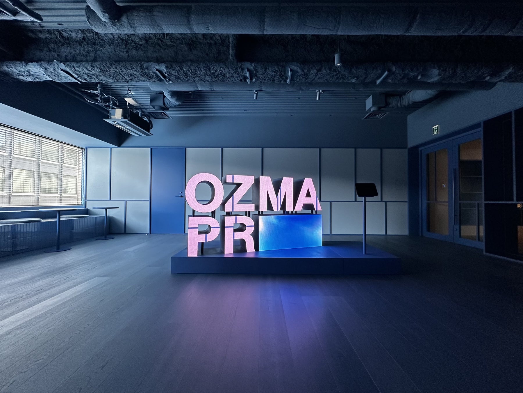 オフィスの顔となるエントランスは、オズマピーアールのブランドカラーであるブルーを基調とした開放的な空間に生まれ変わりました。新たに設置した“OZMA PR”の文字をかたどったデジタルサイネージでは、当社のこれまでの歩みなどを紹介するブランドムービーなどを表示し、お客様をお迎えします。