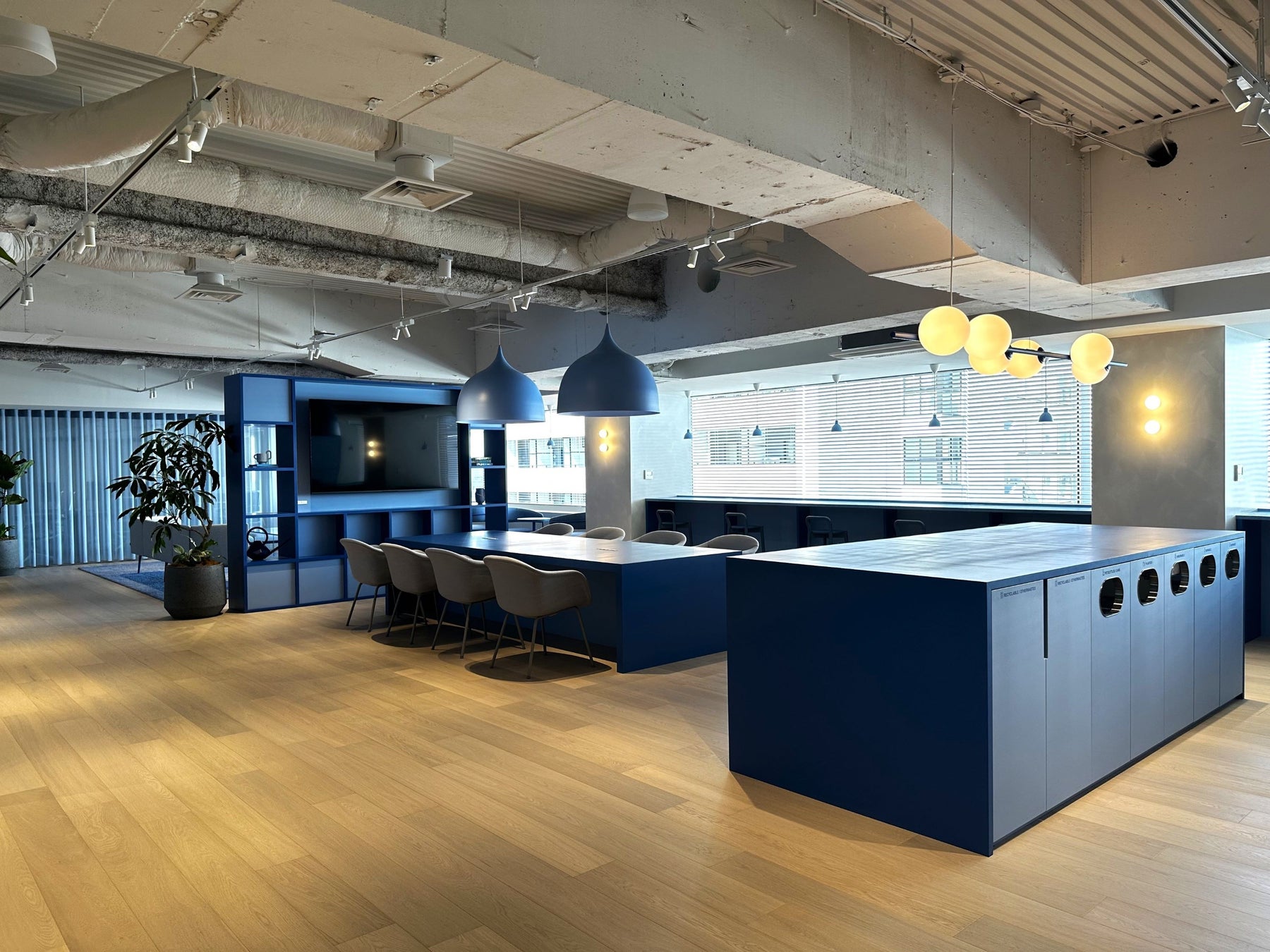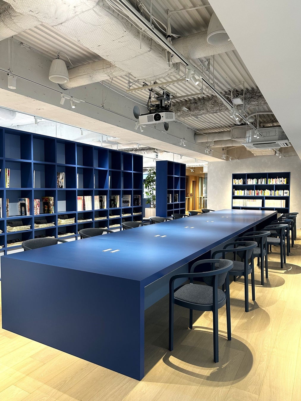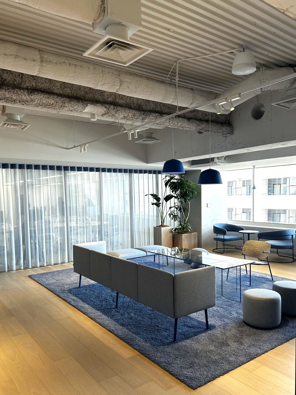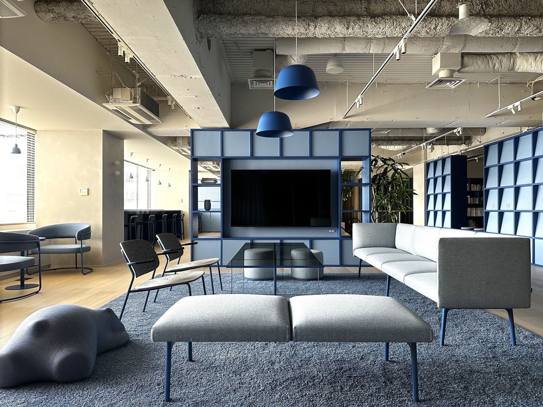 オズマピーアールのブランドカラーであるブルーで統一されたスタイリッシュなラウンジエリアは、当社のメンバー同士や、社外の方々との交流が生まれ、新たな情報に出会える空間です。