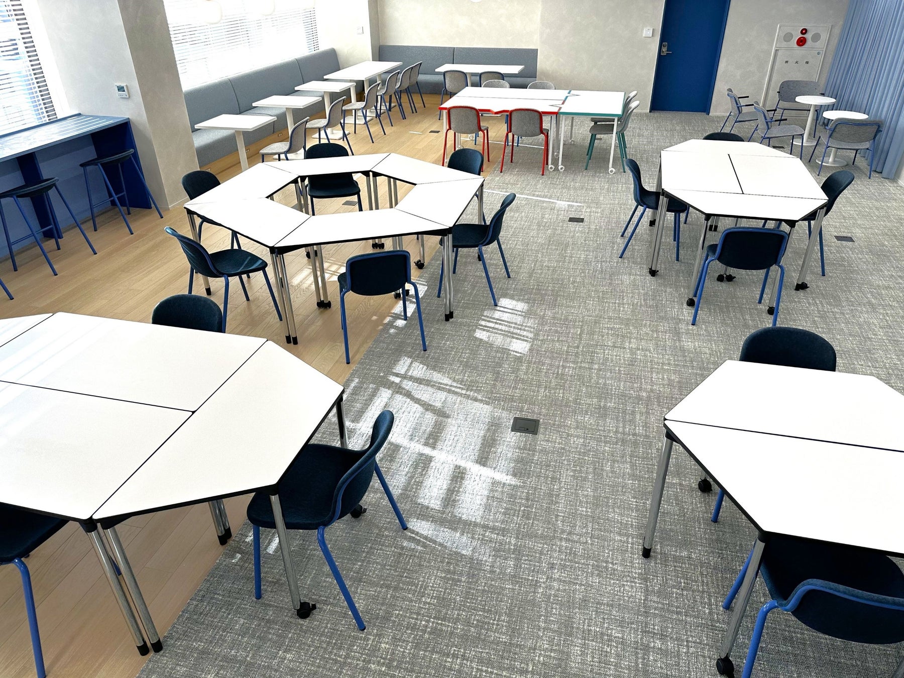 自然と会話が生まれる配置のオフィスデスク、ディスカッションや共同作業など参加人数や用途に応じて組み替え可能なテーブル、集中してソロワークに取り組めるブースなど設け、業務内容に応じて最適なワークスペースが選択できます。また、カフェテーブルやソファを設置したラウンジスペースを設け、チームでの会議や勉強会など多目的に活用していきます。