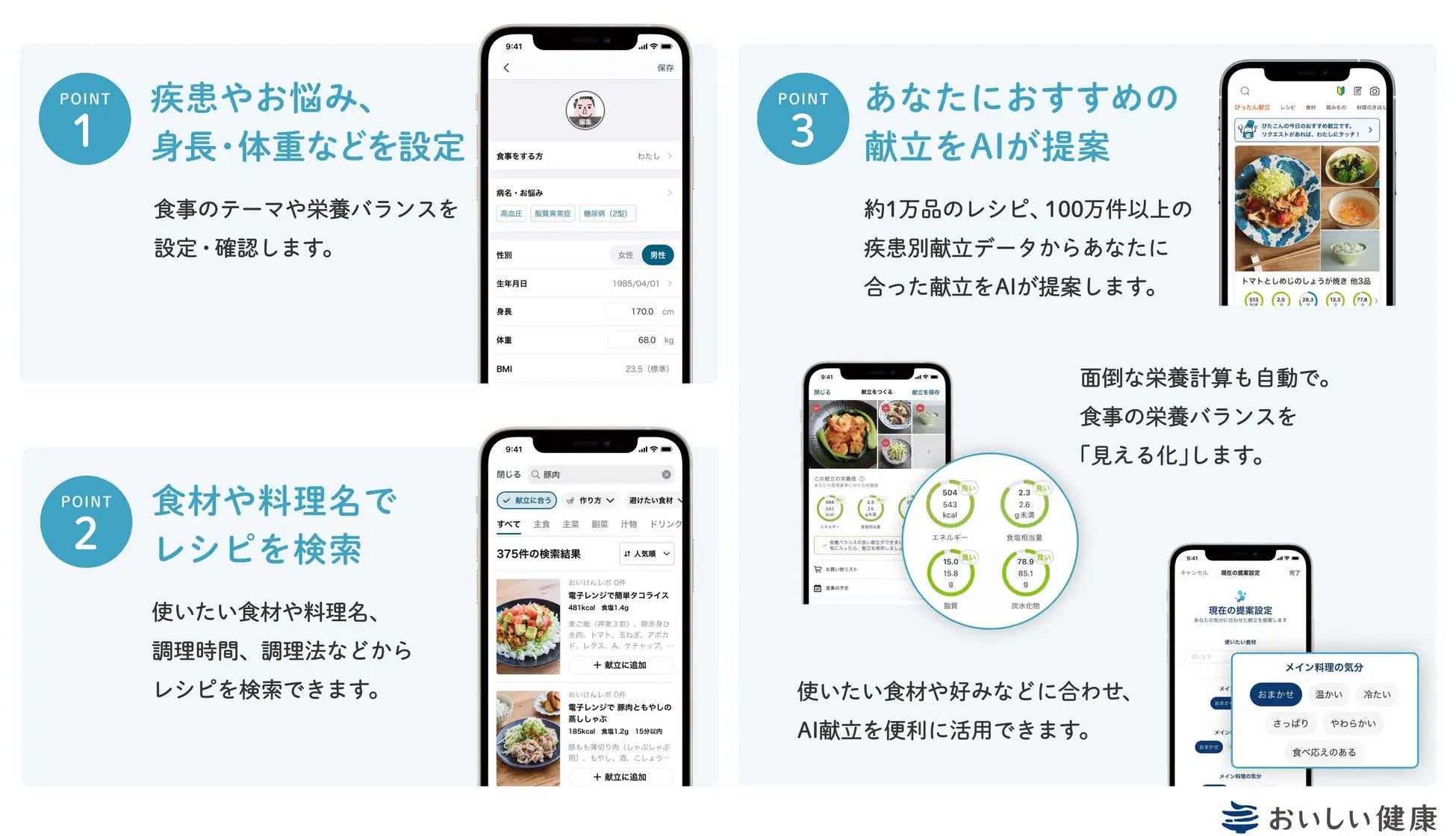スマートフォンアプリ(またはウェブサイト)『おいしい健康』は、利用者の健康状態や疾患、食の好みなどに合わせた最適な献立・レシピをAIが提案する、パーソナライズ食事管理サービスです。厚生労働省「日本人の食事摂取基準」および各疾患の診療ガイドラインに準拠した食事、または医療機関から指示される食事療法の内容に基づき、予防、ダイエット、疾患ごとの食事管理を、ご家庭で手軽に実践いただけるよう支援いたします。