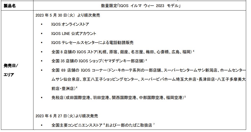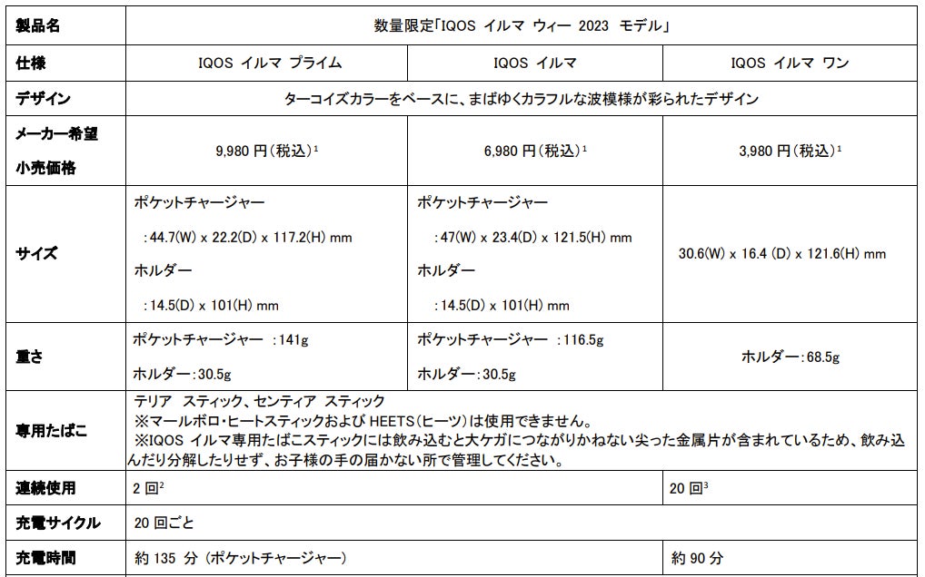 フィリップ モリス ジャパン合同会社(本社:東京都千代田区、社長:シェリー・ゴー、以下「PMJ」)は、ブレードをなくし、使用後のクリーニングが不要になるスマートコア・インダクション・システム®を搭載した加熱式たばこ「IQOS イルマ シリーズ」の「IQOS イルマ プライム」、「IQOS イルマ」、「IQOSイルマ ワン」より、まばゆく、カラフルな波模様デザインを施した数量限定「IQOS イルマ ウィー 2023 モデル」を、5月30日(火)から、IQOSオンラインストア、IQOS LINE公式アカウント、IQOSテレセールスセンターによる電話勧誘、および全国8店舗※のIQOSストア、IQOSショップ(ヤマダデンキ一部店舗)、IQOSコーナー(ドン・キホーテ系列一部店舗他)で、6月27日(火)から、全国の主要コンビニエンスストアおよび一部のたばこ取扱店で、順次発売いたします。