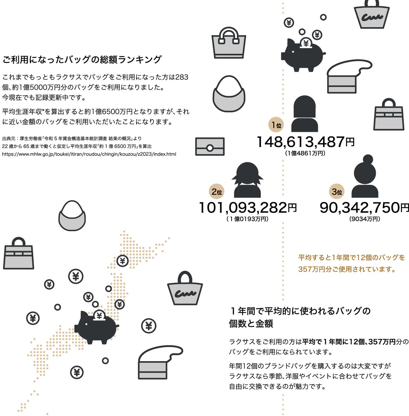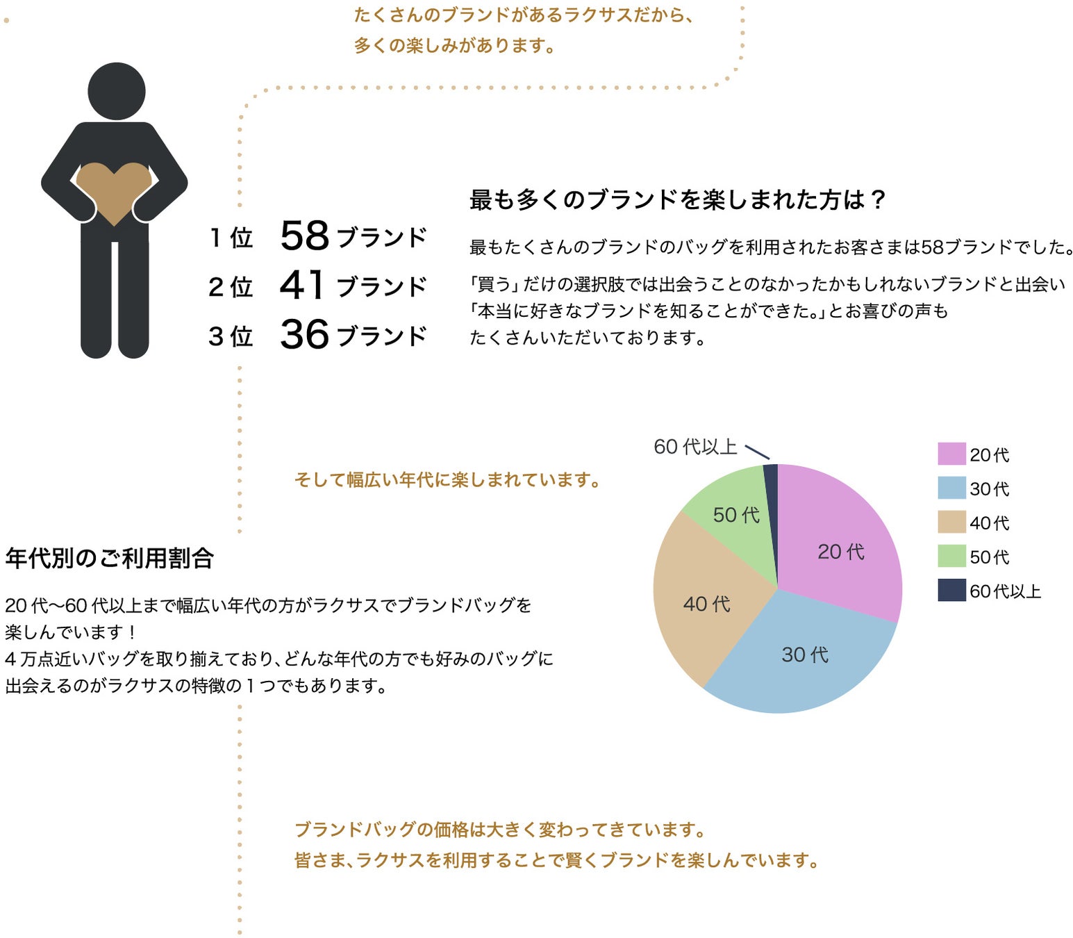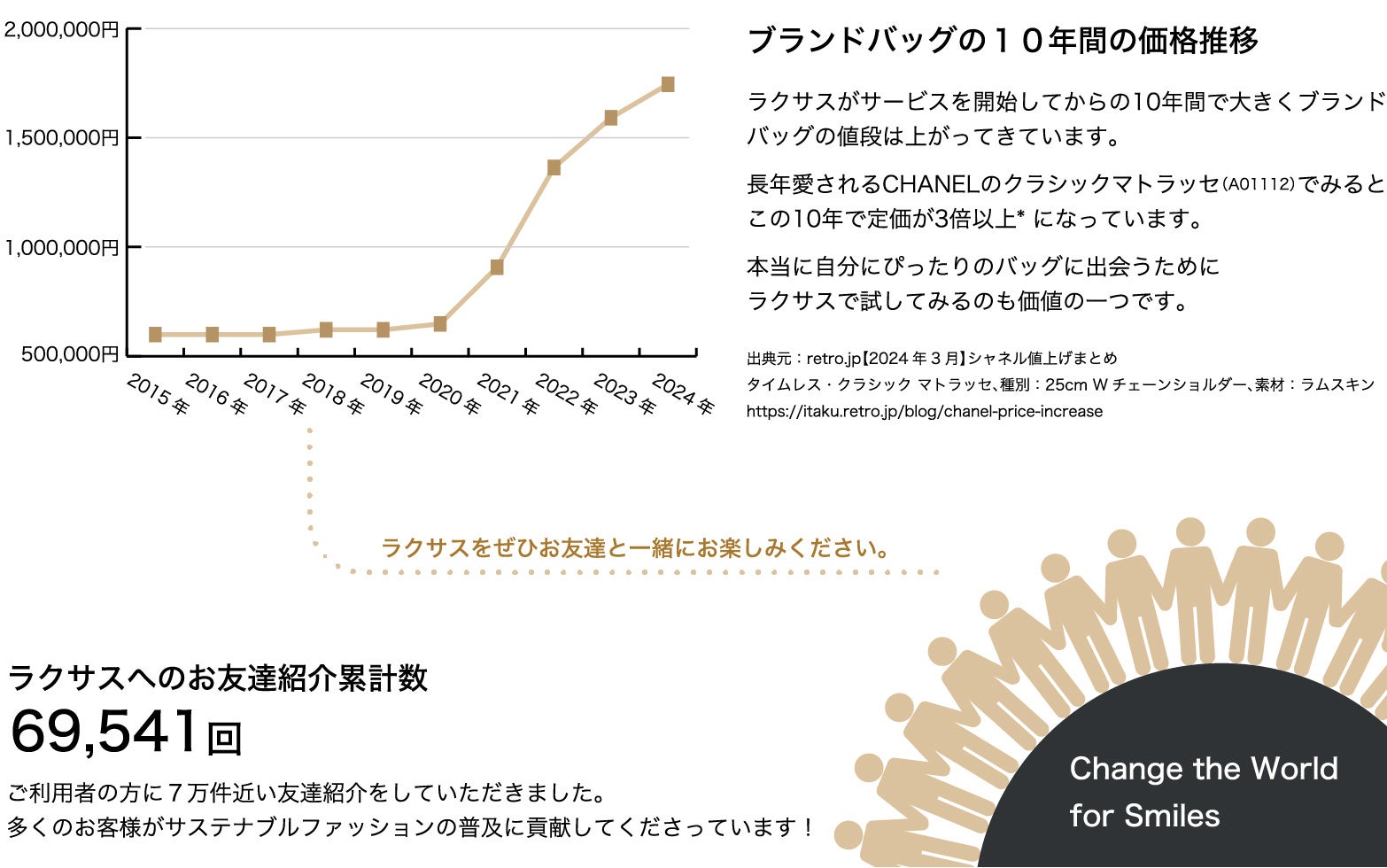 2015年にスタートしたラクサスは、ブランドバッグを「所有」ではなく「共有する」という新しい価値観を提案し、社会に革新をもたらしてきました。当社は、2006年の創業以降、「本当に良いものを愛し、作り手の想いをつなげたい。」「あこがれをみんなでシェアしたい。」という想いから、「世界中に笑顔を」を経営理念に事業に取り組んでまいりました。ラクサスは、これからも「より良いバッグ体験」を提供し、すべての人が自由にオシャレを楽しめる世界を目指して進化を続けてまいります。今後ともご期待ください。