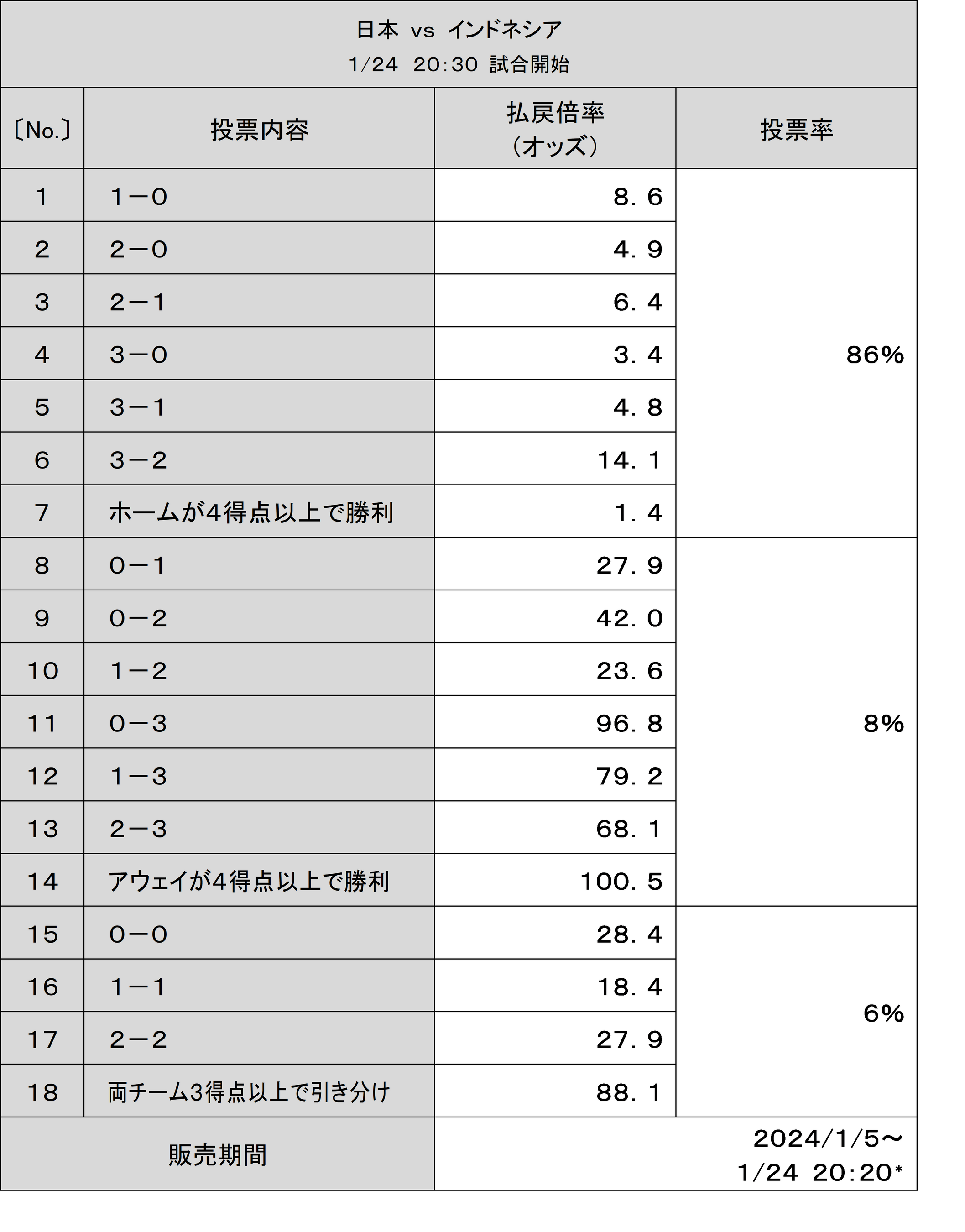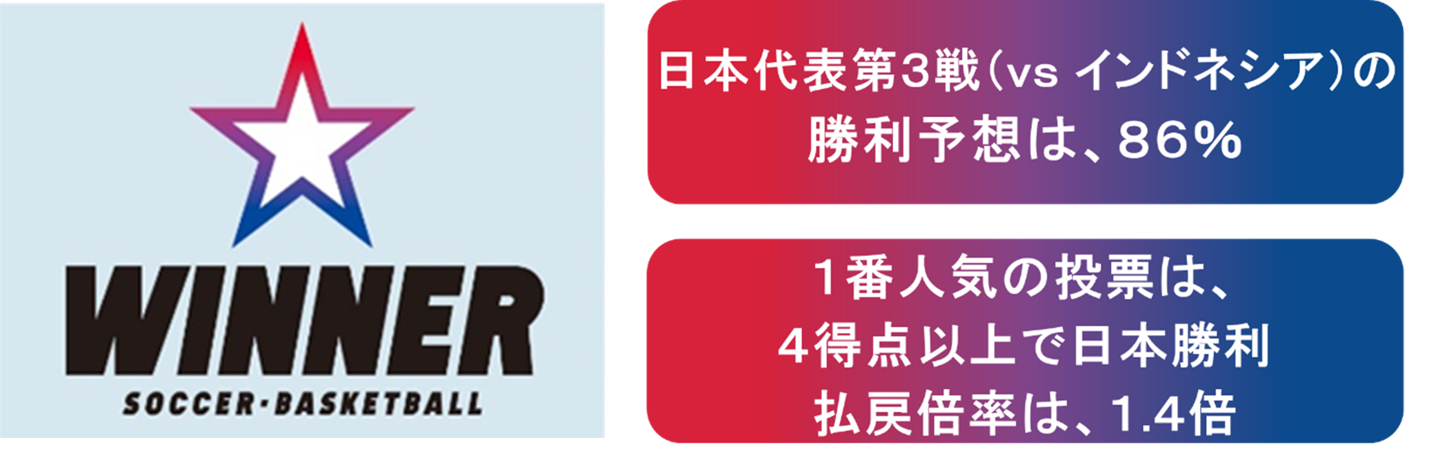 ・1月24日(水)開催予定の第3戦(vs インドネシア)、日本の勝利予想は、86%※2。1番人気の投票は、4得点以上で日本勝利で、払戻倍率(オッズ)は1.4倍!