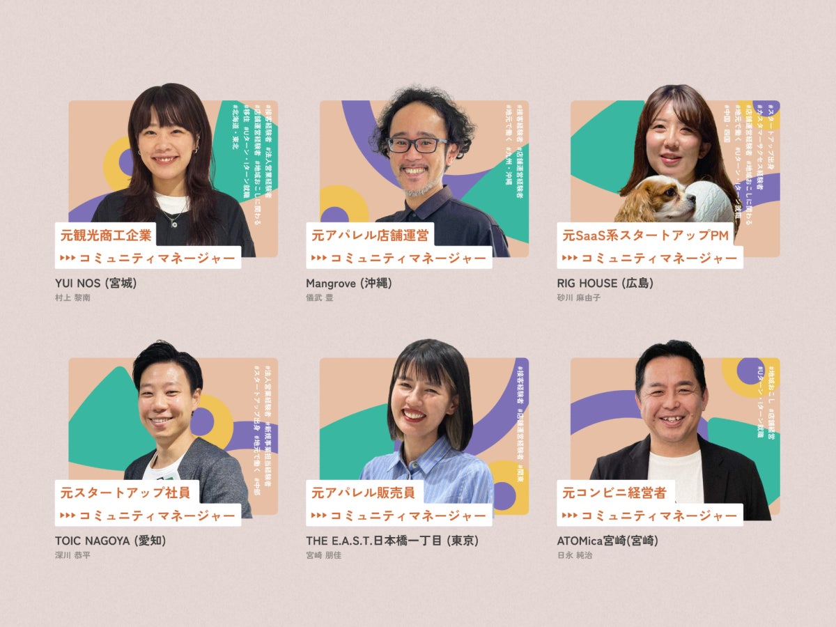 全国各地域の拠点では、正社員から業務委託まで様々な雇用形態でコミュニティマネージャーが活躍していますが、そのほとんどが未経験からのキャリアチェンジを経ており、アパレル、ブライダル、ジムインストラクター、学校教員、起業家、コンサル、エンジニア、スタートアップなど多種多様な業界から、「頼り頼られる関係性を増やす。」に興味関心のある仲間が集まっています。