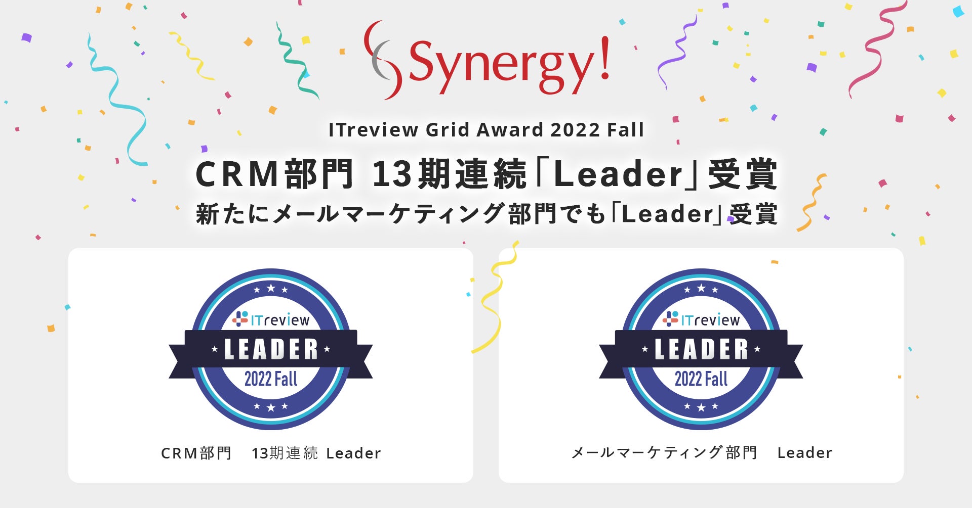 「Synergy!」が「ITreview Grid Award 2022 Fall CRM部門」で「Leader」を13期連続受賞、新たにメールマーケティング部門も