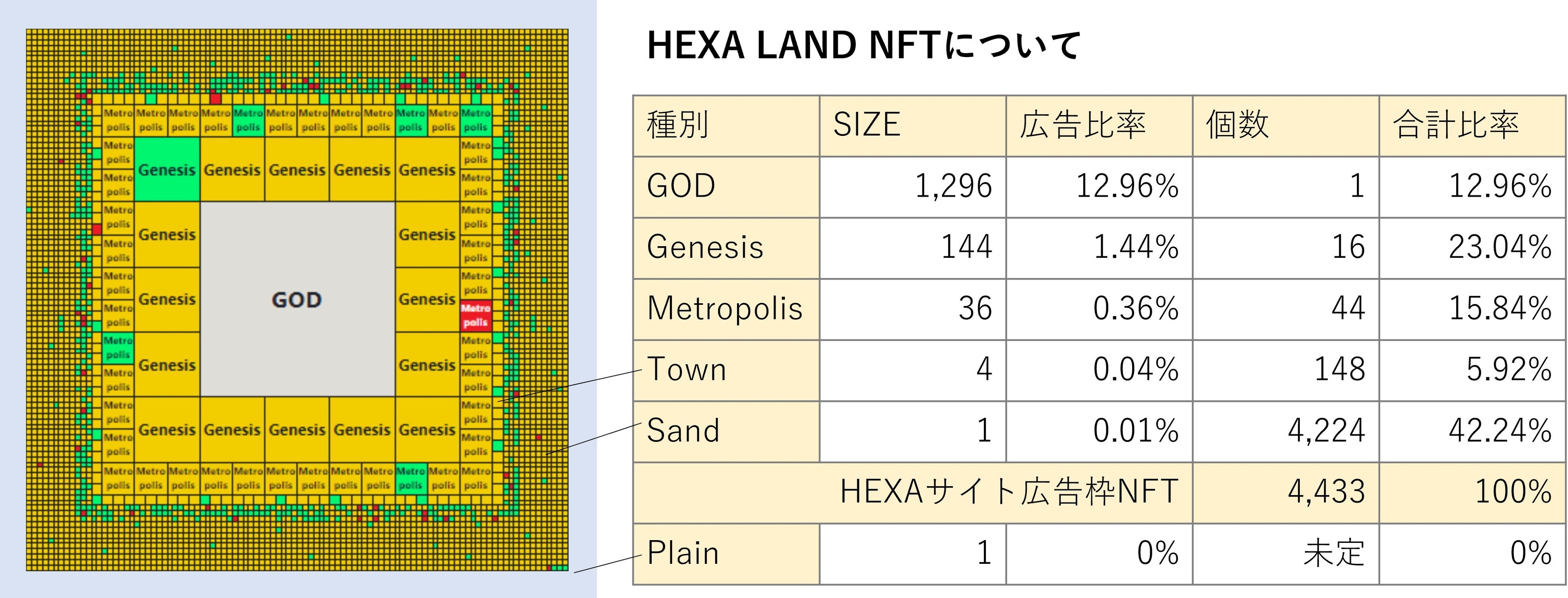 HEXA LANDとはPolygon(MATIC)チェーン上に発行されるLAND NFTとなります。HEXA LAND NFTは全体を100%とし、GOD、Genesis、Metropolis、Town、SandのLAND NFTに分割されています。HEXA LAND NFTの所有比率によって、将来のHEXAプラットフォームへの広告の掲出割合が変わります。HEXAプラットフォームのスポンサー枠として、NFT保有者はプラットフォームの一等地に露出することができます。さらに、今後リリースされるHEXAメタバースの LANDに建物などが置けるようになります。