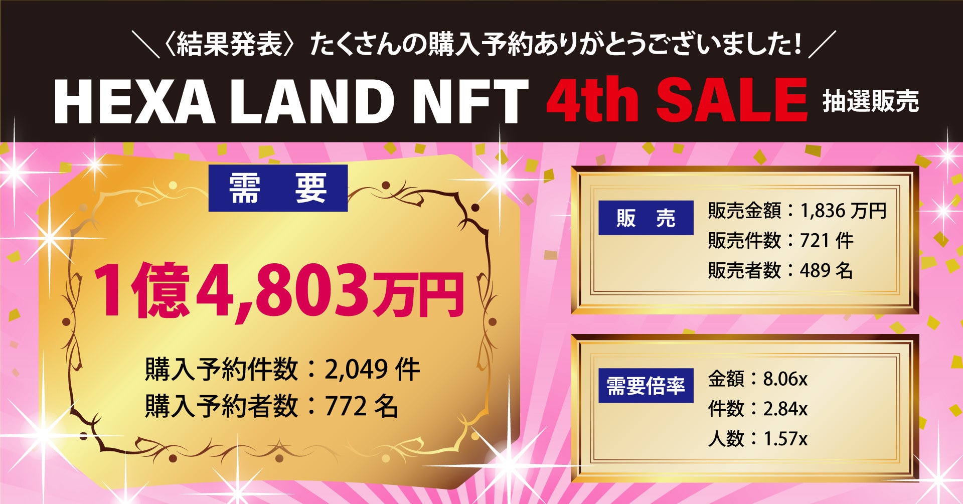 24時間で1億4,803万円の購入予約!うち1,836万円分がHEXA LAND 4thセールで販売され、需要倍率は約8倍となりました
